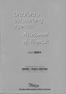 Details the Council’s privatisation plans including the education strategic partnership, proposed transfer of the city’s housing stock to local housing companies, private involvement in information and communications technology, asset management joint venture and the wider social and economic impact on some of the most deprived wards in Britain, for Bradford UNISON (32 pages).