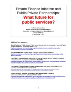 Private Finance Initiative and Public Private Partnerships โ What Future for Public Services? Examines the origins of PFI/PPPs, the their claimed rationale and 25 reasons to oppose PFI/PPP projects which include: