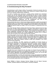 An article in Local Government Chronicle, 9 June 2011, describes commissioning as a wolf in sheep’s clothing because it will lead to private monopoly, commercialised services, agendas dominated by the vested interests of private contractors and little transparency. Sets out an alternative approach. www.lgcplus.com