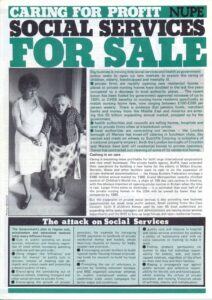 Social Services for Sale, 1984, shoes how children, the elderly and disabled bear the brunt of cuts and privatisation, the effects of rate capping and cashing in on care, NUPE London and East Midlands (4 pages). 50,000 copies were distributed nationally.