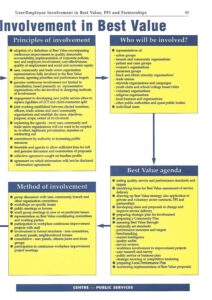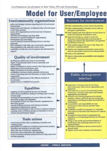 A Model for User/Employee Involvement in Best Value had earlier been developed by the Centre for Public Services as part of Public Service Practice No. 7 (1998 out of print) but a summary of the model is enclosed below.