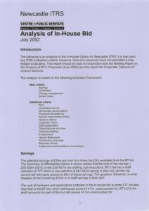 In 2001 Newcastle City Council began a procurement process for ICT and corporate services. UNISON began a series of briefings to Councillors making the case against outsourcing and the failures private contractors and workplace meetings. Following industrial action, the Labour Group agreed that an in-house bid should be prepared. A series of workshops involved senior management, staff and trade unions examined how services could be improved, reorganised together with new ICT systems. The Council gave a commitment to fully engage with staff in the affected services and to involve trade unions. An in-house bid was prepared by a group of senior officers.