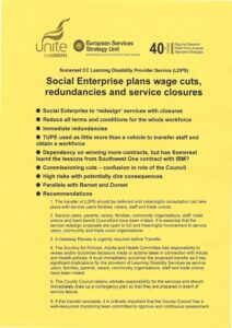 Two joint briefings by UNITE Somerset and ESSU on the transfer of Somerset County Council’s Learning Disability Provider Service (LDPS) to a social enterprise operated by Dimensions (UK) Limited. The first briefing (July 2016) made the case against transfer and recommended an improved in-house service. The second (March 2017) detailed the draconian changes to all terms and conditions for 1,150 staff together with service closures.