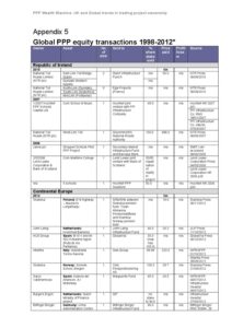 The ESSU UK PPP EQUITY DATABASE and the PPP WEALTH MACHINE: UK and GLOBAL TRENDS in TRADING PROJECT OWNERSHIP report on the sale of equity in PPP projects in the UK and globally. It recorded 281 PPP equity transactions involving 716 PPP projects (including multiple changes in some projects) 1998-2012. Included a sample of 93 transactions involving 226 PPP projects profit and annual rate of return data.