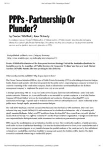 Dexter Whitfield author of βGlobal Auction, of Public Assetsβ, describes the damaging effects of so-called Public Private Partnerships in a detailed interview with the New Left Project in March 2010 . He outlines why they are a disastrous way to provide essential services and he details a democratic alternative to PPPs.