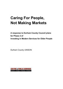 A response to Durham County Council plans for Phase 2 of Investing in Modern Services for Older People by Durham County UNISON The report examines the limits of expanding the social care market in the County, the impact of further homes closures and analyses the options. The County Council voted narrowly to stop further closures following a UNISON and community campaign.