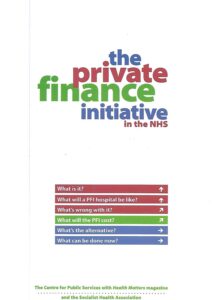 This Briefing has been produced by the Centre for Public Services with Health Matters and the Socialist Health Association (1999). It explains what is the PFI, what a NHS hospital will be like, what’s wrong with it? what will it cost/ what’s the alternative? and what can be done now?