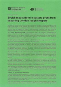 ESSU Briefing raises critical issues for non-profits engaging in core state functions. The London Homelessness Social Impact Bond (SIB) was designed to reduce rough sleeping, but led to two charities to work in partnership with Home Office agencies to ‘reconnect’ non-UK nationals by voluntary repatriation, administrative removal or deportation. Identified eight critical issues for non-profit organisations engaging in any SIB or other similar projects.